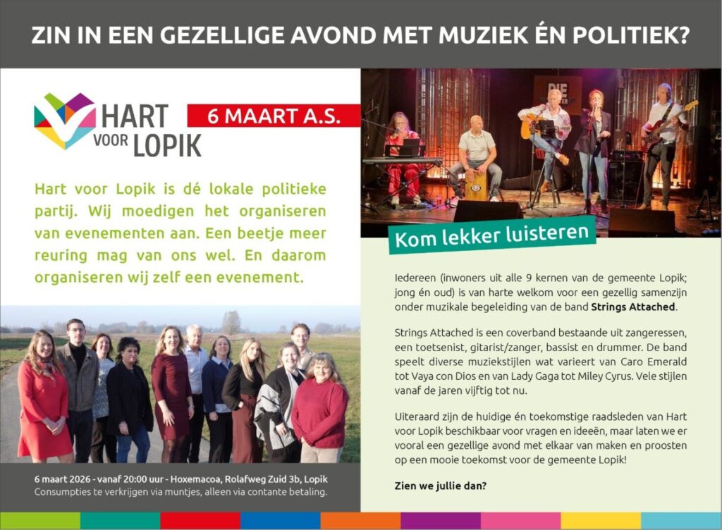 Nieuws: Muziek én politiek 6 maart a.s. om 20:00u in Hoxemacoa; zien we jullie dan? Iedereen (inwoners uit alle 9 kernen van de gemeente Lopik; jong én oud) is van harte welkom voor een gezellig samenzijn onder muzikale begeleiding van de band Strings Attached. Strings Attached is een coverband bestaande uit zangeressen, een toetsenist, gitaris/zanger, […]